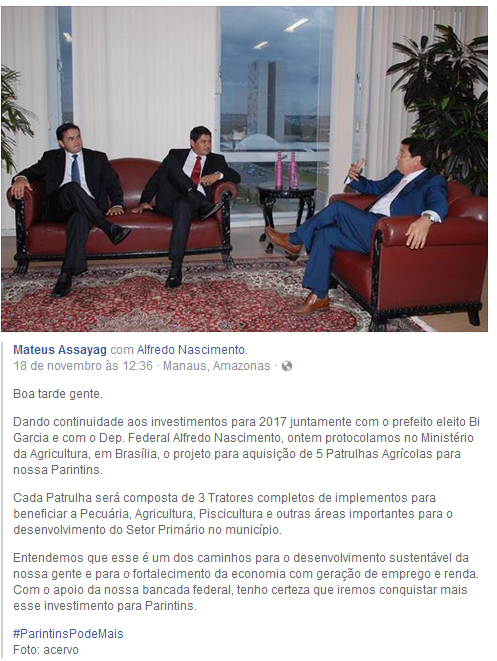 Nada contra ao pedido feito pelo BI, MATEUS e ALFREDO ao Governo Federal, mas precisamos aumentar a qualidade dos nossos pleitos em defesa do setor primário do Amazonas. Os equipamentos necessários ao nosso produtor estão disponíveis nos dois PLANOS SAFRAS (o da agricultura familiar e da empresarial). São bilhões disponibilizados anualmente ao BB, BASA e CAIXA para custeio e investimento que não estão chegando ao produtor rural do nosso estado por diversos motivos. Ocupamos um dos últimos lugares em nível nacional. Quem acompanha este blog sabe quais são esses motivos. O “print” acima, extraído do facebook do ministro Blairo Maggi, mostra o nível do pedido a que estou me referindo. Será que sabemos o que significa ZONEAMENTO AGRÍCOLA DE RISCO CLIMÁTICO? A turma do Rio Grande do Sul certamente sabe, pois estão lá com o ministro Maggi. Será que nossas autoridades sabem que o AM não tem uma cultura agrícola amparada pelas PORTARIAS do Zoneamento Agrícola de Risco Climático? Nem da MANDIOCA, mas no RS já tem até do plantio de OLIVAS. Será que nossas autoridades sabem que o nosso produtor não tem o SEGURO RURAL porque não temos o Zoneamento Agrícola de Risco Climático? Tem muito a mais a sugerir, mas fico por aqui. É apenas uma dica!