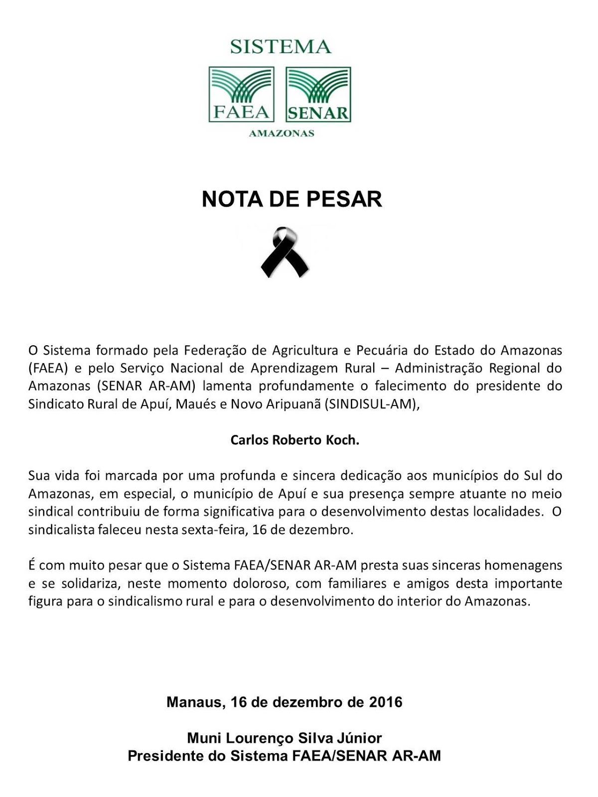NOTA DE PESAR do Sistema FAEA/SENAR