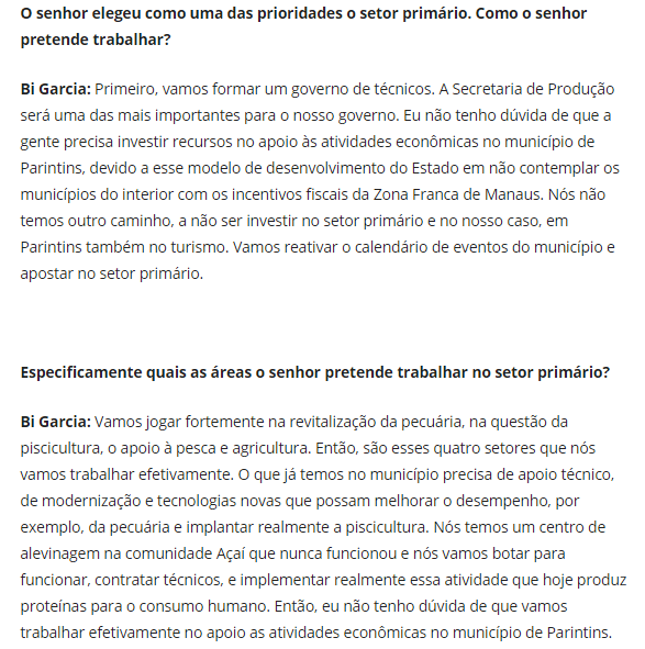 Essa frase foi dita pelo BI durante entrevista ao REPÓRTER PARINTINS. Fiquei feliz, pois não era esse o seu pensamento quando assumiu o primeiro mandato no Palácio Cordovil. O “Thomaz Rural” deseja sucesso ao BI e TONY, e que realmente o produtor rural de Parintins seja prioridade máxima na gestão que começa no próximo dia 01. Não tem outro jeito de melhorar a saúde, educação e segurança se não for com uma economia forte no setor primário. Os reflexos serão positivos e imediatos. Em outras postagens vou comentar as prioridades já anunciadas pelo BI nessa entrevista. Contudo, sugiro ao BI/TONY, e aos demais prefeitos eleitos do AM, que tenham na assessoria (ligada diretamente ao prefeito e/ou vice) uma pessoa que tenha a missão exclusiva de conhecer, profundamente, todos os programas federais ligados ao setor agropecuário. Essa pessoa não pode nem deve ser o secretário, pois não terá tempo para esse aprofundamento. Enfim, poderão ser captados recursos federais estratégicos ao setor agropecuário. Falando de produtos regionais, por sua estratégica localização e conhecida potencialidade, jamais poderão ficar de fora da prioridade o CACAU e FIBRA (malva). Ambos os produtos tem apoio de programas e políticas federais. Fica a dica, Este espaço estará sempre à disposição para colaborar, pois nosso interesse é o crescimento da segurança alimentar e nutricional do nosso POVO.