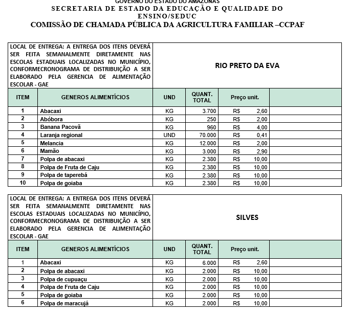 (Rio Preto da Eva e Silves) – Conheça os produtos, quantidades e preços que a SEDUC quer comprar da agricultura familiar para o PNAE