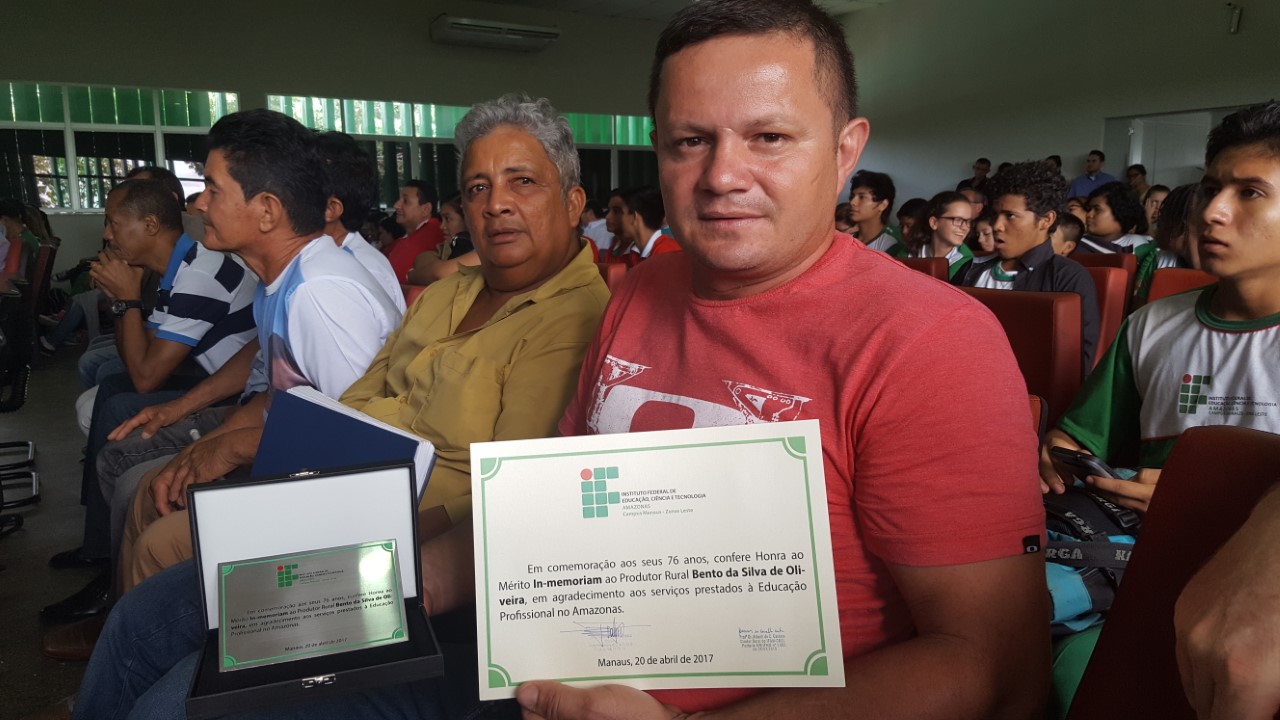 O produtor rural BENTO DA SILVA DE OLIVEIRA, do Novo Remanso, falecido recentemente, foi homenageado durante a solenidade comemorativa aos 76 anos do IFAM pelos relevantes serviços prestados à Educação Profissional no Amazonas. O irmão do Bento recebeu a placa e o diploma.