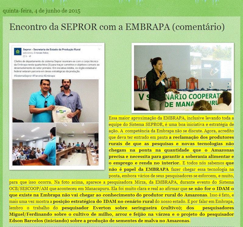 Não sou contra esses encontros, mas o que evoluiu? A Mirza, e outros pesquisadores, já disseram e mostraram o caminho para que as tecnologias da Embrapa cheguem na ponta com maior facilidade e agilidade, mas a “Compensa” não ouve, não liga, só lança PLANOS e NOVA MATRIZ, deixando o IDAM com as pernas curtas e atendendo TUDO e TODOS.