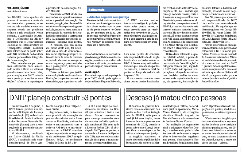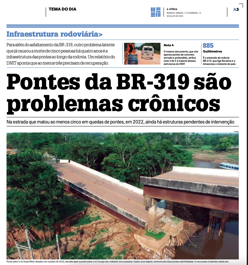 Matéria publicada no jornal A Crítica neste fim de semana… Todas as autoridades do Amazonas sabem que esse travamento vem da área ambiental pública, de ONGs e dos chamados “observatórios”, que enxergam tudo — menos o povo que vive na miséria e os muitos que já morreram em razão das péssimas condições de tráfego.