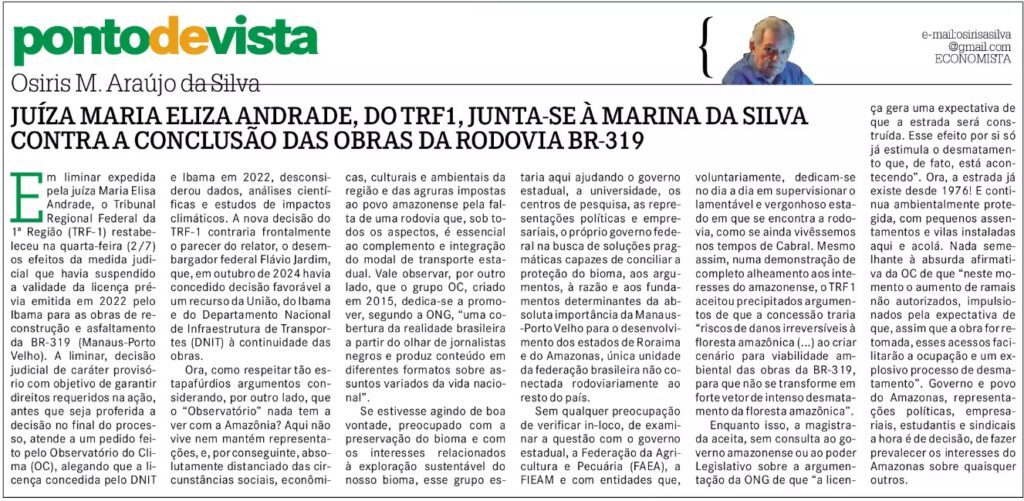 Concordo 100% com o artigo do economista Osíris Silva. Só queria entender o motivo do silêncio dos ex-governadores Eduardo Braga e Omar Aziz, e atualmente do governador Wilson Lima, pois sabem que esse GOL CONTRA vem de ONGs ambientalistas, incluindo a ONG FAS e a ONG IDESAM. A primeira com 78 milhões do banco alemão no “bolso” gastando com um FAZ de conta de um Plano de Bioeconomia (SEM ZEE), e a segunda ONG mandando nos milhões do PPBio da SUFRAMA. É muita falta de coragem e subserviência a quem nos isola. O documento do Observatório do Clima teve a assinatura da ONG IDESAM, que depois, estrategicamente, se retirou por causa dos milhões das indústrias, da Suframa, do PPBio. Elas fazem o que querem, só vejo, até agora, o senador Plínio Valério sem medo e sem rabo preso.