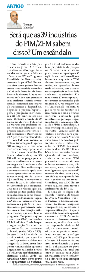 Será que as 39 indústrias do PIM/ZFM sabem disso? Um escândalo!
