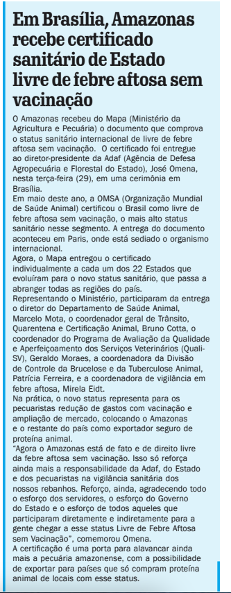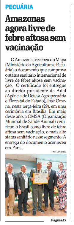 O JC sempre destacando importantes conquistas do AGRO do Amazonas. Essa recebida pelo Omena, da ADAF, teve a participação de várias entidades. Lembro que nos documentos entregues ao candidatos a governo sempre constava o pleito da FAEA, OCB e FETAGRI para o Amazonas ser livre de aftosa sem vacinação. O MAPA/SFA, ainda na gestão do Guilherme Pessoa, foi fundamental. Na ADAF, antes do Omena, lembro do Alexandre, Sérgio e de todos os servidores do órgão que cuida da defesa sanitária animal e vegetal do nosso Estado. O governador Wilson não colocou um obstáculo para essa coquista, sempre apoiando os pedidos dos seus secretários de produção, iniciando com o Petrucio e depois com o Daniel. Manter esse status é o grande desafio.