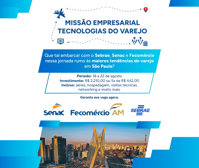 As inscrições estão oficialmente abertas para a Missão Empresarial Tecnologias do Varejo – São Paulo 2025, uma iniciativa estratégica do Sebrae Amazonas em parceria com o Senac e a Fecomércio que ocorrerá entre os dias 18 e 22 de agosto. Voltada para empresários, gestores de micro e pequenas empresas, além de profissionais do comércio de bens, serviços e turismo, a missão tem como objetivo conectar empreendedores amazonenses às principais tendências, práticas inovadoras e tecnologias que estão transformando o setor varejista no Brasil.