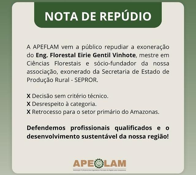 Que bom ver essa NOTA da APEFLAM repudiando a exoneração que aconteceu na SEPROR. As entidades que representam profissionais tem que se posicionar, só assim poderemos mudar o futuro. A APEFLAM também deveria questionar a ONG FAS para saber o nome dos profissionais da engenharia florestal que receberam, segundo a própria ONG, milhões de “assistência técnica” nas unidades de conservação. Penso que o CREA também poderia buscar essa informação para defender as categorias citadas no vídeo abaixo que tem vínculo com o CREA.