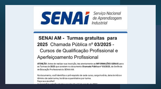 Mais informações, incluindo a lista completa de cursos e horários, podem ser acompanhadas pelas redes sociais do SENAI Amazonas e site