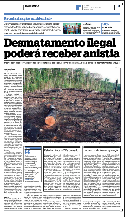 Abaixo da matéria de A Crítica estão listadas as ONGs parceiras desse “observatório”, que insistem em falar em “anistia” e “desmatamento”. O GOL CONTRA vai continuar, a BOLA NAS COSTAS também. Se duvidar, vão entrar na justiça, fazer o mesmo que fizeram com a BR-319 e a mineração.