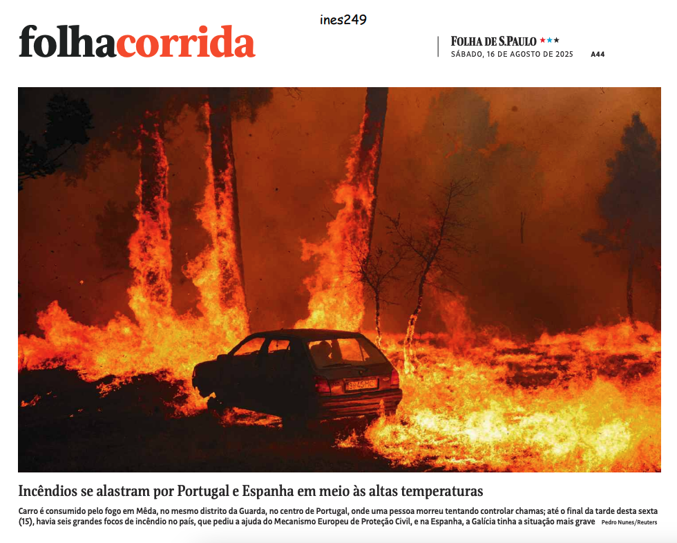 A foto é forte: um carro engolido pelas chamas em Méda, no centro de Portugal. Incêndios também atingem a Galícia, na Espanha. A Folha de S.Paulo descreve o episódio como consequência das altas temperaturas, destacando que a causa está relacionada ao calor extremo do verão europeu.