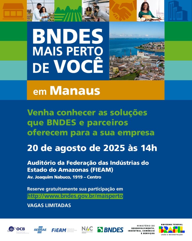 O Sistema OCB, em parceria com a FIEAM e o SEBRAE, apoia a realização do programa BNDES Mais Perto de Você em Manaus, que acontece nesta quarta-feira, 20 de agosto, às 14h, no auditório da FIEAM (Av. Joaquim Nabuco, 1919 – Centro).