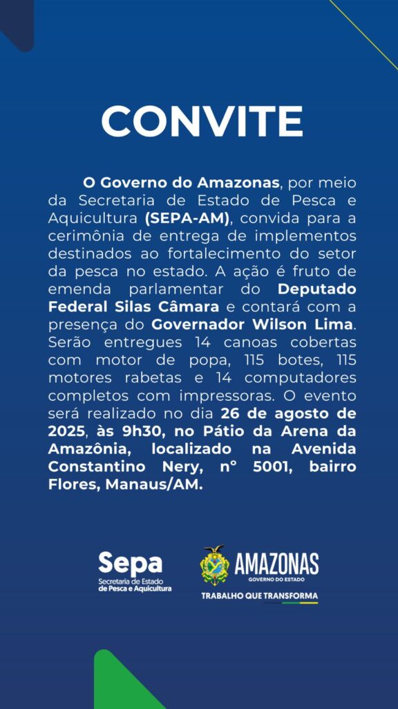 “É com alegria que convidamos você para participar da cerimônia de entrega de implementos destinados ao fortalecimento da pesca no Amazonas, fruto de emenda parlamentar do Deputado Federal Silas Câmara, executada pela Secretaria de Pesca e Aquicultura – SEPA , com a presença do Governador Wilson Lima”