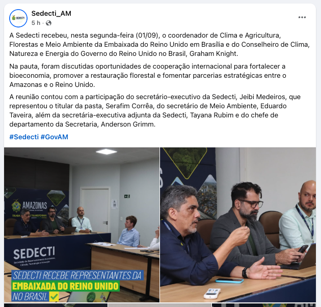 O titular da SEMA, de olho no celular em plena reunião, demonstrou desrespeito aos presentes e, por estar acompanhado do Reino Unido, nem cogitou falar sobre a extrema necessidade do Zoneamento Ecológico-Econômico (ZEE) do nosso Amazonas. Aliás, sem o ZEE — ignorado pelo titular da SEMA desde 2019 — o governador foi obrigado a assinar um decreto reduzindo a reserva legal. Fico impressionado como ex-governadores (Eduardo, Omar) e agora Wilson Lima se deixam conduzir por ONGs e ongueiros. Qual a razão de paraenses e paulista temerem ongueiros cariocas e mineiros que jogam contra o Amazonas e contra o nosso povo? O governador Wilson tem até abril para virar esse jogo na área ambiental. Até agora, não entregou o ZEE, não trouxe um centavo de REDD+ ou de crédito de carbono, além de já enfrentar questionamentos no MPC e no MPF. Para piorar, o titular da SEMA iniciou uma crise no Sul do Amazonas ao enviar ofício à sua amiga de longas datas, a ministra Marina Silva, guardiã do Fundo Amazônia. Do jeito que está, penso que só um amazonense raiz poderá acabar com esse jogo de cena que empobrece o nosso estado. Penso que deve ser a minha última esperança. Já temos mais de duas décadas com a “Compensa” sendo ocupada por paulista e paraenses. Chegou a hora de uma amazonense RAIZ!