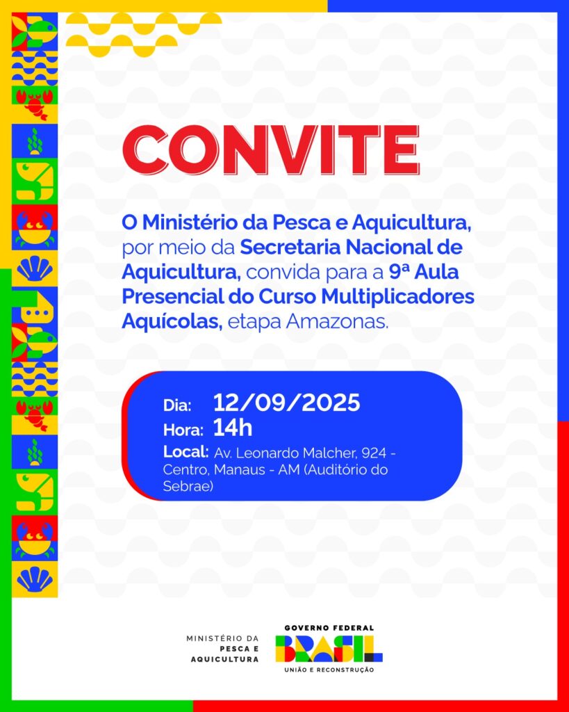 Nesse sentido, informamos que a aula presencial do curso “Multiplicadores Aquícolas” referente ao Estado do Amazonas ocorrerá na cidade de Manaus, no dia 12 de setembro de 2025, das 14h às 18h, no auditório do SEBRAE, localizado Av. Leonardo Malcher, 924 – Centro
