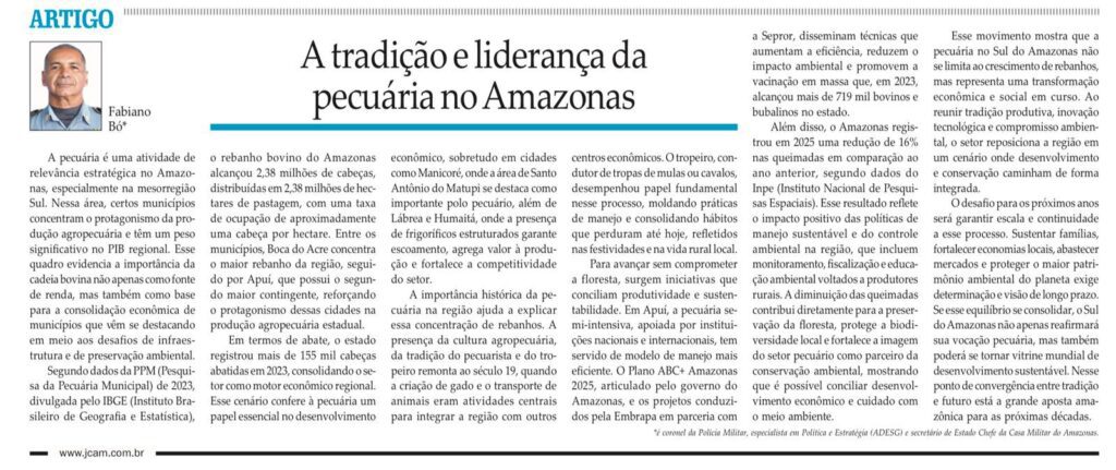 Excelente a manifestação do Coronel Fabiano sobre a pecuária no Estado do Amazonas nas páginas centenárias do Jornal do Commercio. Ele destacou pontos fundamentais, valorizou a ciência da EMBRAPA, o Plano ABC+ Amazonas e a relevância da atividade para a movimentação da economia, gerando emprego, renda e alimento na mesa da população.