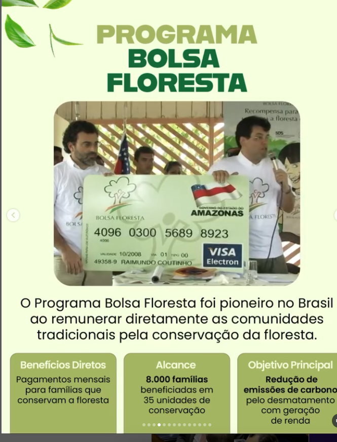 Quem aparece ao seu lado na foto foi seu secretário de Meio Ambiente, hoje eterno comandante da ONG FAS. Ou seja, deixou a Secretaria de Meio Ambiente para assumir a direção da ONG, onde permanece até hoje. Detalhe: a ONG nasceu no mesmo ano da foto que aparece nesse cartão e já nasceu recebendo aporte milionário do Estado. O senador não falou o valor do Bolsa Floresta, mas eu digo: miseráveis R$ 50 reais por longos anos, 15 anos. E tem mais: desde 2008 até hoje, essa ONG já recebeu cerca de meio bilhão de reais, mas nunca reajustou o benefício, que permaneceu congelado em R$ 50, sem alterar em nada a vida do caboclo que preserva a floresta. Esse programa serviu muito mais como vitrine para captar recursos nacionais e internacionais do que para melhorar a realidade das comunidades. Pode até ter mudado a vida de outras pessoas, mas nunca a do verdadeiro guardião da floresta.