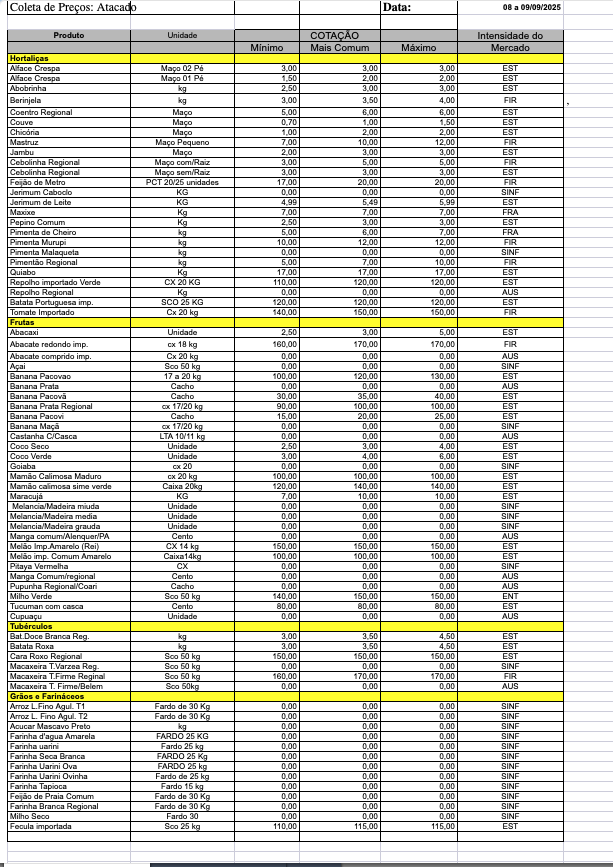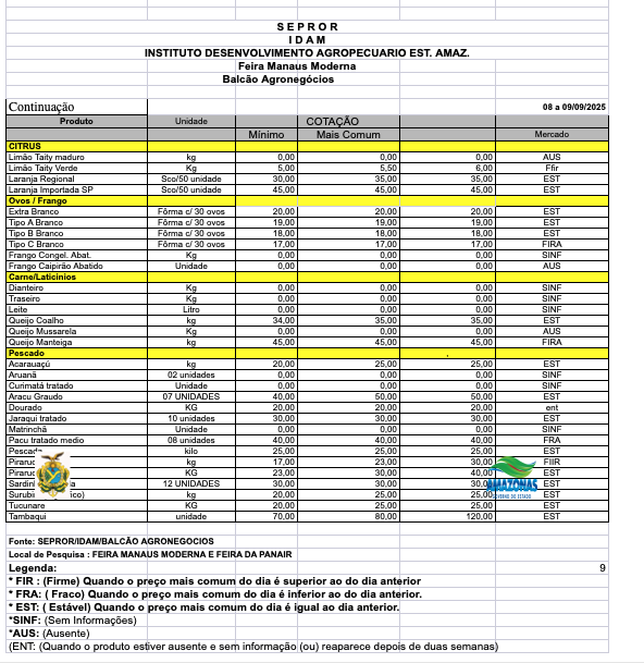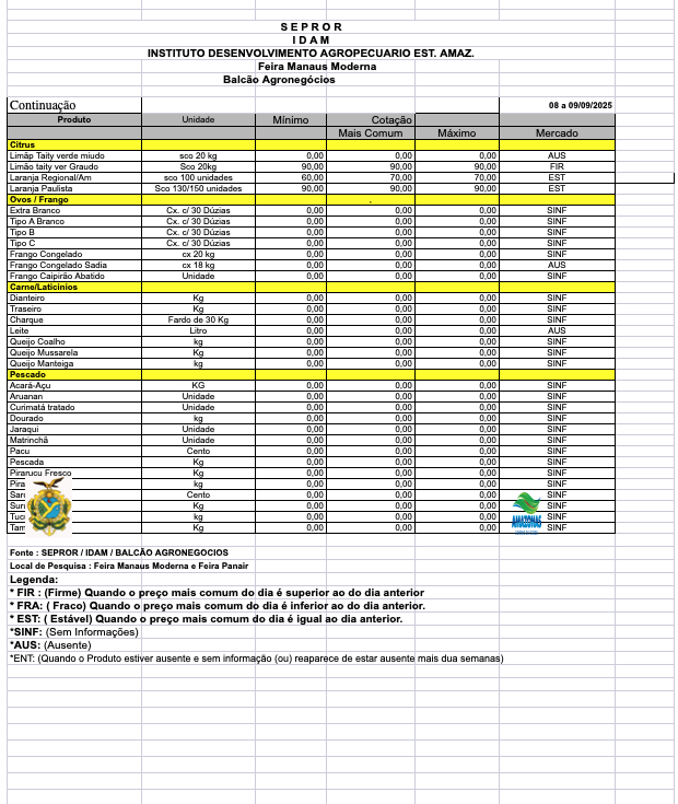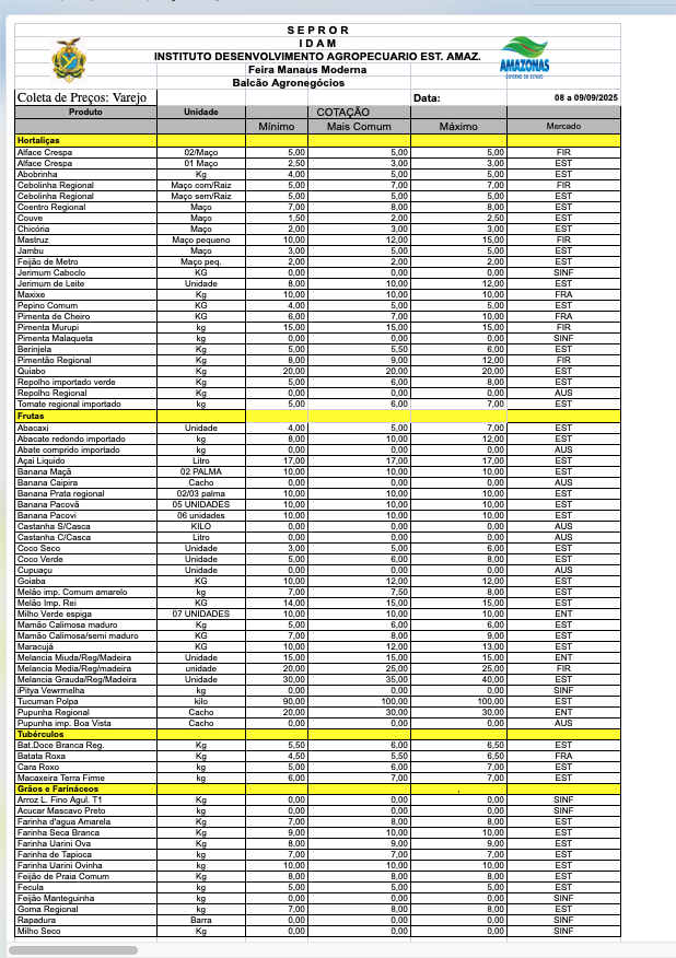 Abaixo, pesquisa de preço no ATACADO e VAREJO divulgado pelo BALCÃO DE AGRONEGÓCIOS do SEBRAE-AM em parceria com IDAM, FAEA, SENAR e FUNDEPEC.