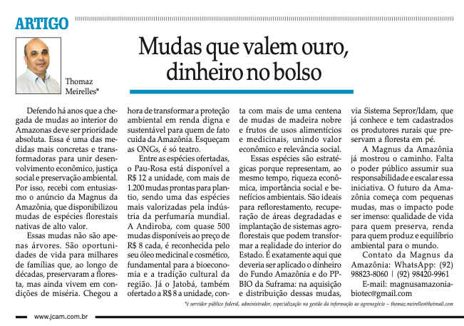 Este é o meu artigo desta terça-feira no Jornal do Commercio. Desde 2013, escrevo no JC, sempre buscando divulgar e opinar sobre caminhos para o desenvolvimento do Amazonas. O artigo de hoje destaca mais uma dessas alternativas que levam dignidade ao caboclo que preserva o verde para o mundo.