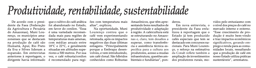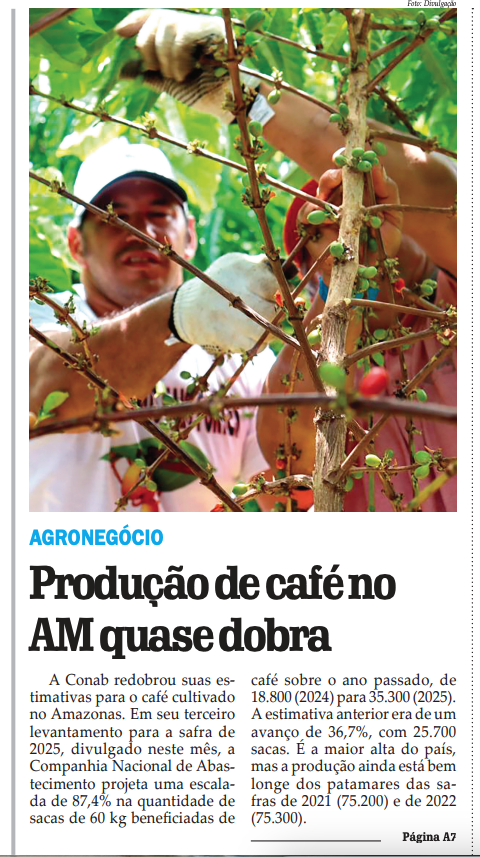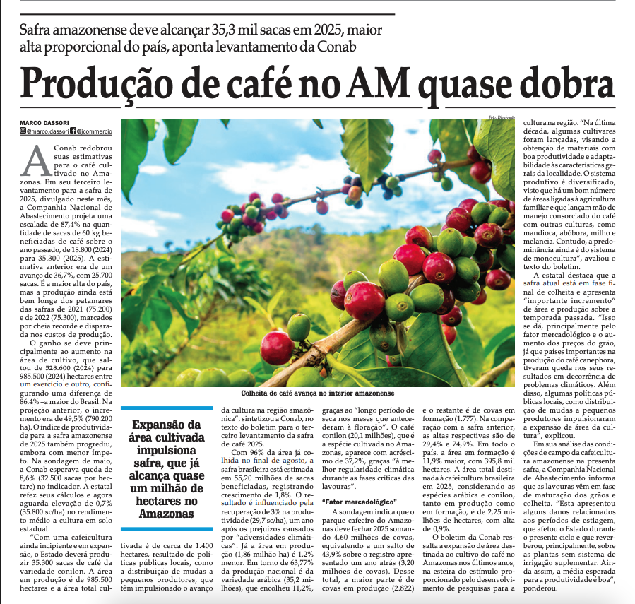Mais uma vez, o Jornal do Commercio traz uma matéria exclusiva e de qualidade voltada ao AGRO do Amazonas, assinada pelo jornalista Marco Dassori. A reportagem destaca o crescimento visível da produção de café no Estado e conta com a análise do presidente da FAEA, Muni Lourenço, que ressalta o apoio tecnológico da EMBRAPA, garantindo uma produção altamente sustentável.