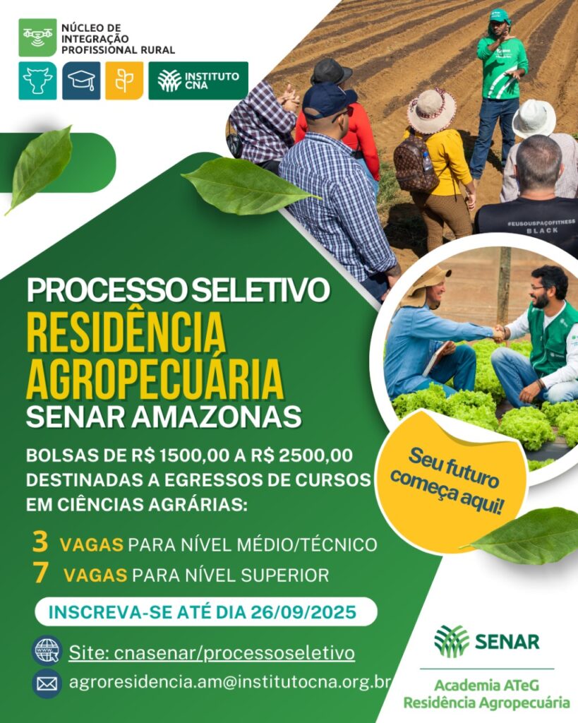 O SENAR Amazonas, em parceria com o Instituto CNA, abre inscrições para o Programa de Residência Agropecuária.
