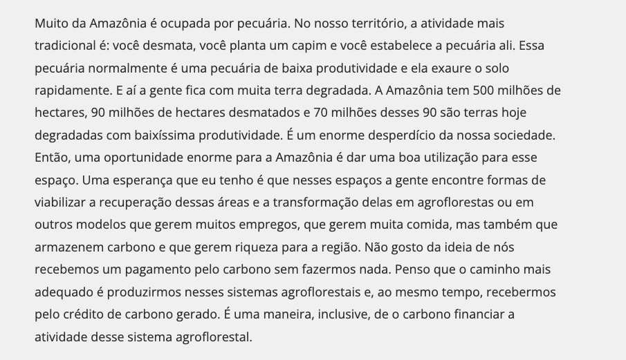 Primeiro, queria ouvir sua opinião sobre a ausência do Zoneamento Ecológico-Econômico (ZEE) no Amazonas. Esse instrumento foi previsto desde 1981, na Política Nacional de Meio Ambiente (Lei 6.938/81), mas aqui nunca avançou. É um tema que não aparece nem no discurso da ministra Marina, nem das ONGs (FAS, IDESAM e “observatórios”). Li também, na coluna Follow Up, a defesa do plantio de árvores em larga escala — ideia correta, mas que não dialoga com o nível da nossa agricultura familiar. No Amazonas, 97% da produção é de agricultura familiar, um público que ocupa o penúltimo lugar nacional no acesso ao financiamento do PRONAF desde 1999. São agricultores sem crédito, sem assistência técnica, sem energia, sem internet e com fome. Eles não têm condições de esperar uma década por resultados. Sei que você sabe dessa realidade, é só um reforço. Sobre infraestrutura, concordo com sua fala: estradas precárias encarecem a vida e os produtos. Mas lembro que a BR-319 está travada por pressões ambientais de ONGs como a FAS e o IDESAM. Gostaria de saber sua visão sobre o papel dessas entidades que jogam contra o desenvolvimento SUSTENTÁVEL e ignoram a ciência da EMBRAPA.