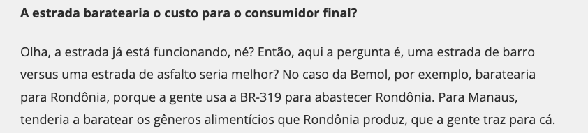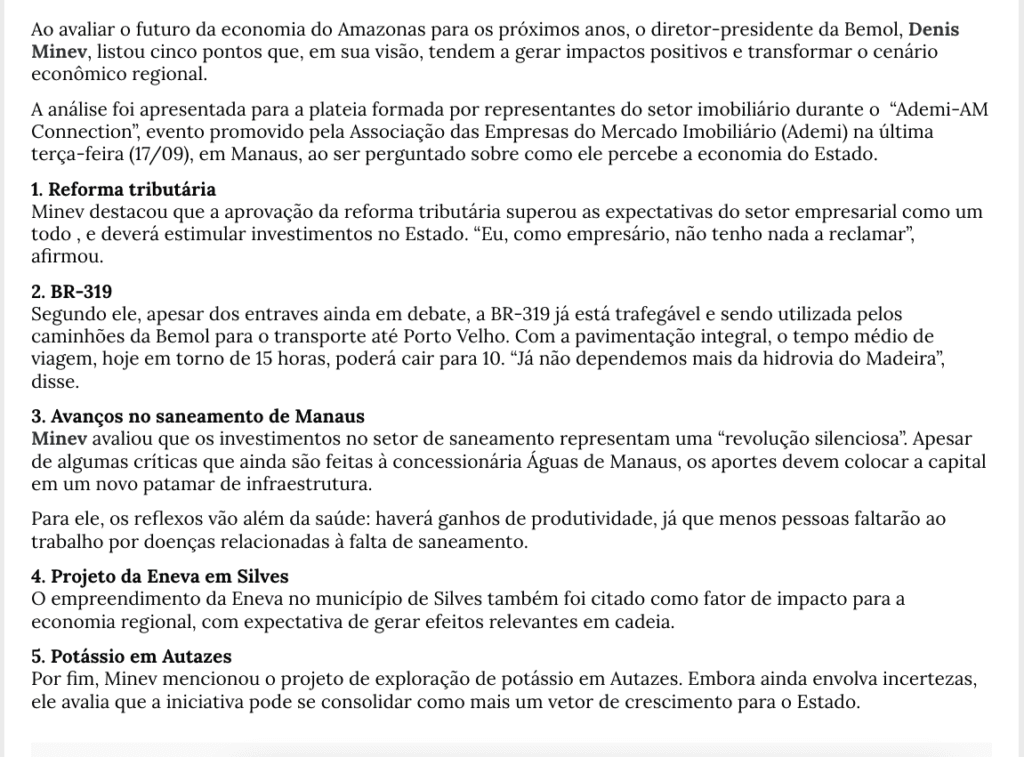 Achei positiva a entrada da BEMOL no setor de empréstimos. Além do vazio bancário no Amazonas, a burocracia dos bancos oficiais sufoca quem produz. O setor privado pode contribuir para reduzir essa lacuna. O estado já tem 21 cadeias produtivas mapeadas (SEPROR/IDAM) e a EMBRAPA tem tecnologia pronta. Mas, sem o ZEE e sem liberar licenciamento dentro dos 20% permitidos pelo Código Florestal, só veremos avanços pontuais e a pobreza continuará crescendo. Estamos exportando empreendedores em razão da burocracia, das travas, do freio de mão puxado.