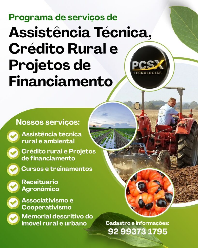Conheça, abaixo, o contato e os serviços prestados pela PCSX TECNOLOGIAS. A empresa é do Pedro Chaves, pessoa muito conhecida no AGRO familiar e empresarial do Amazonas. O foco da sua empresa está em um dos maiores gargalos para o desenvolvimento econômico do Amazonas, o CRÉDITO RURAL. Sucesso!
