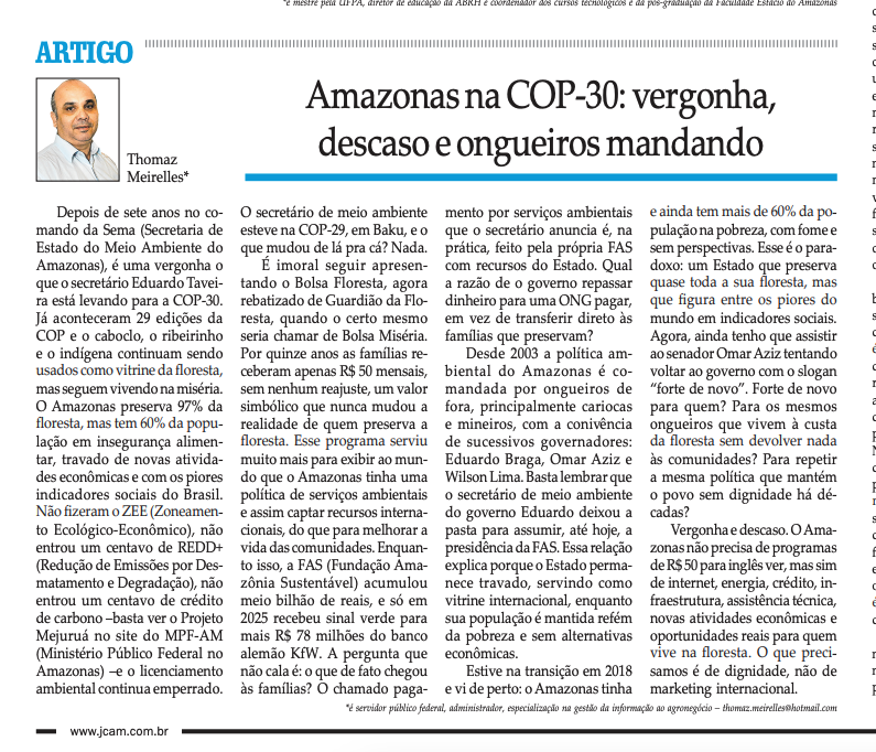 Meu artigo foi publicado no Jornal do Commercio na terça-feira, ontem, dia 23.09.2025. Leia e veja a imoralidade e o descaso com o povo que vem passando FOME há décadas, só aumentando. E tem mais: mantendo a FLORESTA EM PÉ para os financiadores do clima e ongueiros terem uma vida, como diz o senador Plínio Valério: “nababesca”, ou seja, uma vida de luxo, ostentação e riqueza, completamente distante da realidade sofrida da população amazônida. Até quando os governadores continuarão sendo silenciados? Qual o motivo? Jamais iremos destruir a FLORESTA como fizeram os países que financiam o Brasil e ONGs, mas viver sem dignidade para bancar luxo é inaceitável. Enquanto Humaitá, Manicoré, Apuí vivem o caos, e o resto do interior esperando rancho, vi no site da SEMA que o titular da secretaria, ongueiro carioca, está na China falando de BIOSFERA que não colocou um centavo no bolso do nosso caboclo. Nenhum pronunciamento dele ou do IPAAM sobre o que aconteceu por lá. Ainda hoje vou postar mais vídeo do pós…
