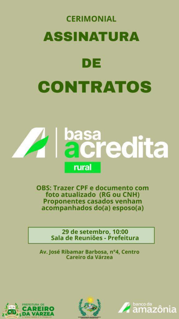 Na manhã da segunda-feira (29/09), foi realizada uma cerimônia no município de Careiro da Várzea, marcada pela assinatura de contratos de crédito rural junto ao Banco da Amazônia (BASA). O evento contou com a presença do prefeito Pedro Guedes, vereadores do município, além de representantes da Secretaria Municipal de Produção e da Secretaria Municipal de Pesca, com apoio total da Prefeitura. Na ocasião, agricultores familiares, pescadores artesanais, pecuaristas e piscicultores foram beneficiados com financiamentos voltados ao fortalecimento da produção rural e pesqueira. O acesso a esse crédito foi viabilizado por meio da emissão do Cadastro Ambiental Rural (CAR) e do Cadastro Nacional da Agricultura Familiar (CAF), instrumentos fundamentais para inclusão produtiva e regularização dos produtores. A assistência técnica fornecida pela Secretaria Municipal de Produção Rural desempenhou papel decisivo no processo, garantindo que os beneficiários pudessem cumprir os requisitos necessários para a liberação dos recursos. O evento reforça a importância das parcerias institucionais entre governo municipal, BASA e produtores locais, fortalecendo o desenvolvimento sustentável e a geração de renda no interior do Amazonas.