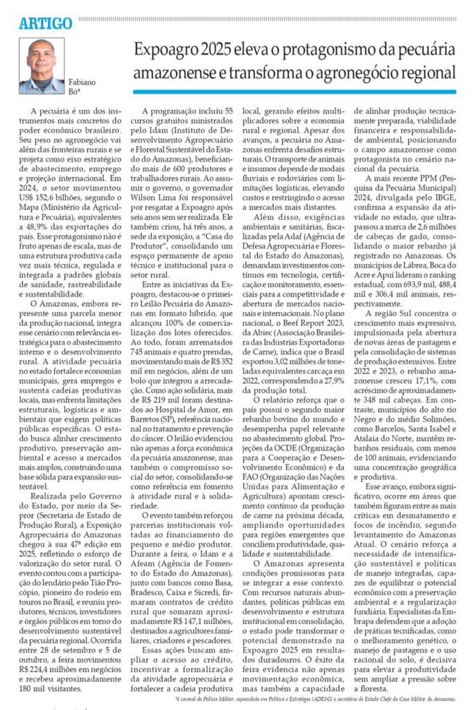 Artigo publicado no Jornal do Commercio do Amazonas, o que mais dedica espaço ao AGRO do Amazonas. Leia, abaixo, a coluna do Fabiano Bó destacando a EXPOAGRO 2025, o AGRO e a PECUÁRIA do Amazonas.