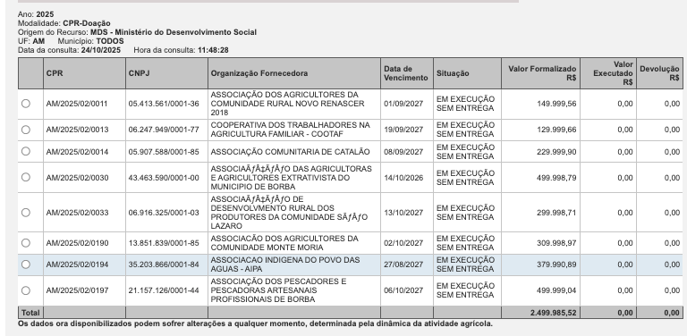 A Conab/Ministério do Desenvolvimento Social (MDS) publicou os valores das operações de CPR-Doação em andamento no Amazonas para 2025. Até o momento, oito organizações fornecedoras do estado estão com contratos formalizados e em execução, totalizando R$ 2.499.985,52 destinados à produção agrícola familiar, beneficiando diretamente agricultores e comunidades tradicionais em diversos municípios. Esses recursos reforçam a importância das organizações locais na segurança alimentar e na comercialização da produção rural, fortalecendo a economia e gerando mais oportunidades no campo. Tem que fiscalizar a pesagem e qualidade do produto em todos os momentos da operação: Ao receber do produtor rural e ao entregar na entidade social que vai receber o produto. O fato de ser DOAÇÃO não pode “relaxar” o CRAS ou similar no momento do recebimento. Os conselhos precisam acompanhar de perto.