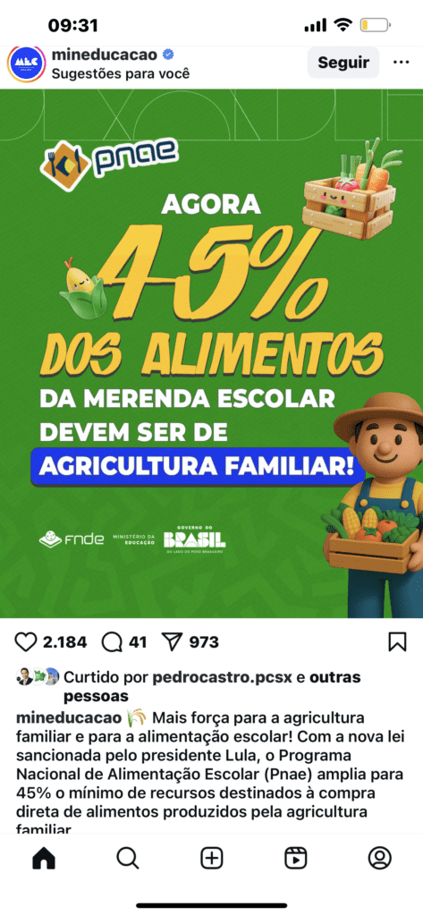 A decisão do governo federal é corretíssima, mas infelizmente a corrupção na execução do estado e municípios impede desse benefício chegar ao campo como deveria. A imagem é uma publicação do Ministério da Educação do Brasil sobre o Programa Nacional de Alimentação Escolar (PNAE). A postagem informa que, com a nova lei sancionada, o mínimo de recursos destinados à compra de alimentos da agricultura familiar para a merenda escolar foi ampliado para 45%.