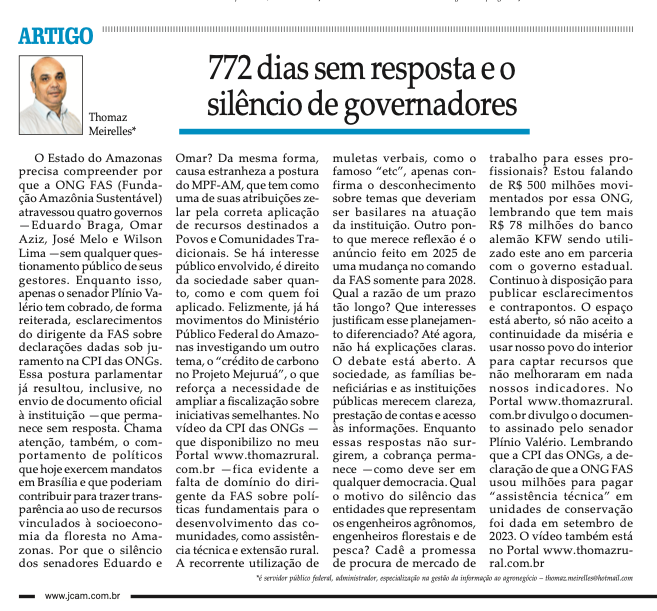 Até hoje não obtive resposta — nem consegui entender o motivo de os senadores Omar Aziz e Eduardo Braga não terem comparecido à CPI das ONGs, realizada justamente no mesmo local onde ambos trabalham. Naquela ocasião, estiveram presentes a ministra do Meio Ambiente e o comandante da ONG FAS, duas figuras bastante conhecidas dos senadores. Aliás, a própria ONG FAS nasceu no governo Eduardo/Omar, sob o comando de quem havia sido secretário de meio ambiente por vários anos. Fica a pergunta: será por esse motivo que ambos se ausentaram da CPI em setembro de 2023 (vídeo abaixo)? Anos depois, os dois aparecem criticando a ministra Marina Silva. Coincidência? Ou efeito da proximidade das eleições de 2026? O fato é que atacam a Marina, mas não compareceram à CPI quando tiveram a chance de questioná-la frente a frente. E quanto aos R$ 500 milhões movimentados pela ONG FAS, e aos milhões pagos em “assistência técnica” nas unidades de conservação, o silêncio deles é ensurdecedor. Reconheço: ambos têm direito legítimo de se candidatar quantas vezes quiserem, e possuem lados positivos. Mas nessa pauta, não me fazem de idiota. Podem até enganar a ALEAM e alguns deputados federais que comeram abiu, mas desta minha tribuna direi a verdade. O povo que elege vocês não merece esse descaso, muito menos essa estratégia do silêncio que mantém o ralo aberto por onde escoam milhões para ONGs. Ainda bem que temos um senador amazonense, Plínio Valério, usando a tribuna e fazendo as cobranças que deveriam ser de todos nós. Tenho leitores que perguntam o motivo da insistência nesse tema. A resposta é simples: estamos falando de bilhões, não de centavos, muito mal utilizados. Temos os piores indicadores sociais e econômicos do Brasil, tenho que defender os famintos da capital e o desprezado caboclo do interior, sem emprego e sem renda. Não aceito usarem nosso caboclo de escada.