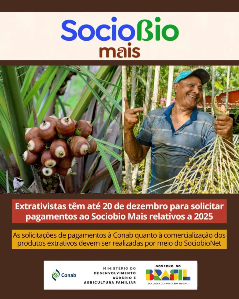 Os pedidos de pagamento do Sociobio Mais referentes a 2025 devem ser enviados à @conab_oficial até 20 de dezembro.