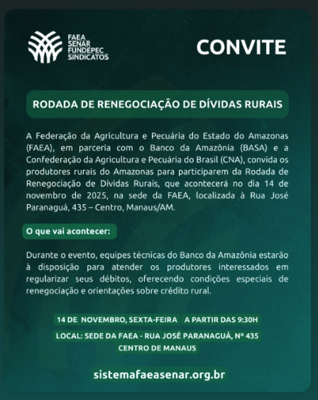 No dia 14 de novembro (sexta-feira), a FAEA, em parceria com o Banco da Amazônia (BASA) e a CNA, realiza a Rodada de Renegociação de Dívidas Rurais.