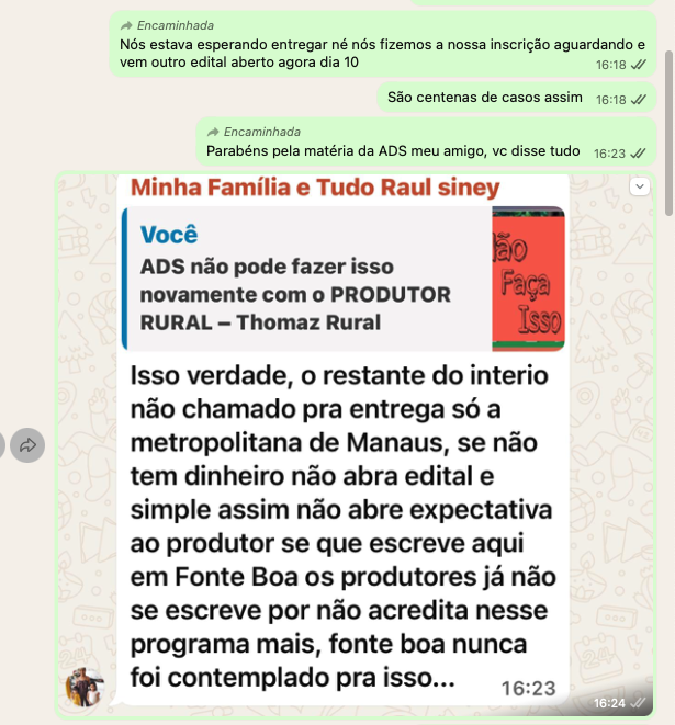 Em primeiro lugar, nada contra a equipe técnica da ADS — eles apenas obedecem comando. Se for para melhorar o salário e garantir uma graninha com diária, tudo bem! Mas deslocar servidores novamente para realizar ações itinerantes, tendo o IDAM presente na ponta, não faz o menor sentido. Outro ponto: se fizerem um levantamento dos que se cadastraram no ano anterior e dos que realmente forneceram este ano, o resultado será vergonhoso. Sem contar que a ADS já possui um extenso banco de dados dos credenciamentos anteriores, e a SEPROR também tem um número enorme de produtores cadastrados no PAA.