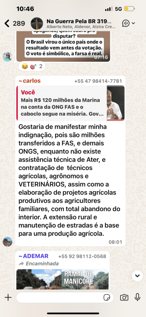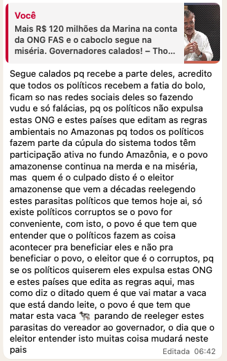 Repito e reforço: não sou candidato a nada em 2026. Já tenho esta “tribuna” e a coloco à disposição de todos vocês que não aguentam mais viver em um estado riquíssimo, mas com o povo pobre. Um estado isolado sem a BR-319, sem ZEE-AM, sem Zoneamento Ecológico-Econômico, e que exporta seus empreendedores para estados vizinhos porque aqui reina a incompetência da política ambiental e o silêncio cúmplice das comissões da Assembleia Legislativa.