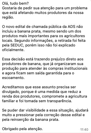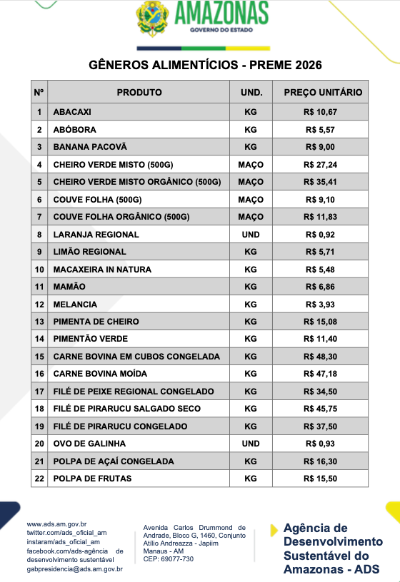 Outro dia foi a reclamação pela ausência da farinha de mandioca. Agora, é o produtor de banana prata indignado porque sequer aparece na lista da ADS. E o mais curioso — para não dizer imoral — é que alguns itens nunca saem da lista: carne bovina, polpas e pescado.