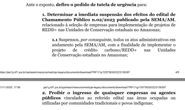 A Justiça Federal determinou a imediata suspensão dos efeitos do edital da SEMA/AM, bem como de todos os atos administrativos vinculados à implementação do projeto de crédito de carbono/REDD+ nas Unidades de Conservação estaduais. A decisão também proíbe a entrada de qualquer empresa ou agente público em áreas ocupadas ou utilizadas por comunidades tradicionais e povos indígenas. Mesmo após sete anos de governo, Wilson Lima insiste em manter a mesma estrutura de gestão ambiental marcada por resultados frágeis, dependência de ONGs e sucessivas ações judiciais contestando seus atos. Qual é a razão dessa persistência diante da comprovada falta de eficiência e da ausência de benefícios concretos para o povo do Amazonas? Veja, abaixo, a decisão de hoje da Justiça Federal. Este espaço continua aberto para quem quiser se manifestar.