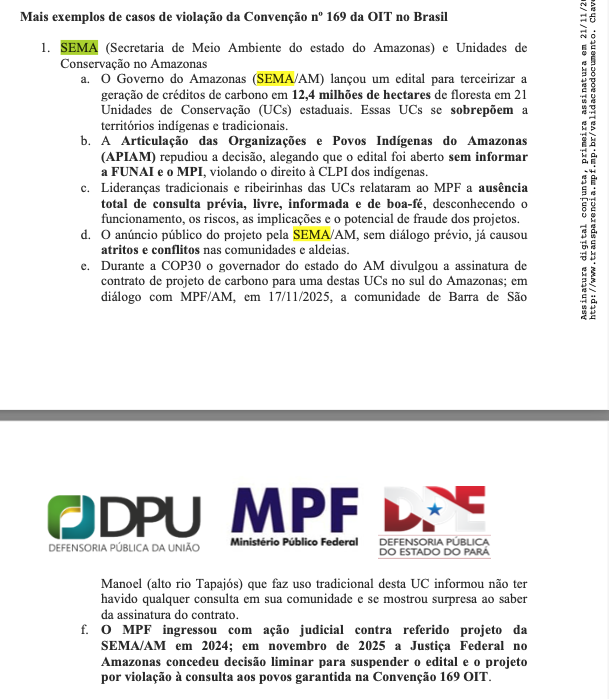 Além da decisão de ontem da Justiça Federal (link abaixo), houve também a publicação de uma NOTA TÉCNICA, igualmente do dia 21/11/2025, assinada por DPU, MPF e DPE do Pará. Espero que a Defensoria Pública do Amazonas tome conhecimento e acompanhe o caso, pois a Secretaria de Estado de Meio Ambiente do Amazonas, a SEMA-AM, volta a ser diretamente citada. A Nota expõe inclusive o governador, ao mencionar a assinatura realizada no último dia 17/11/2025.