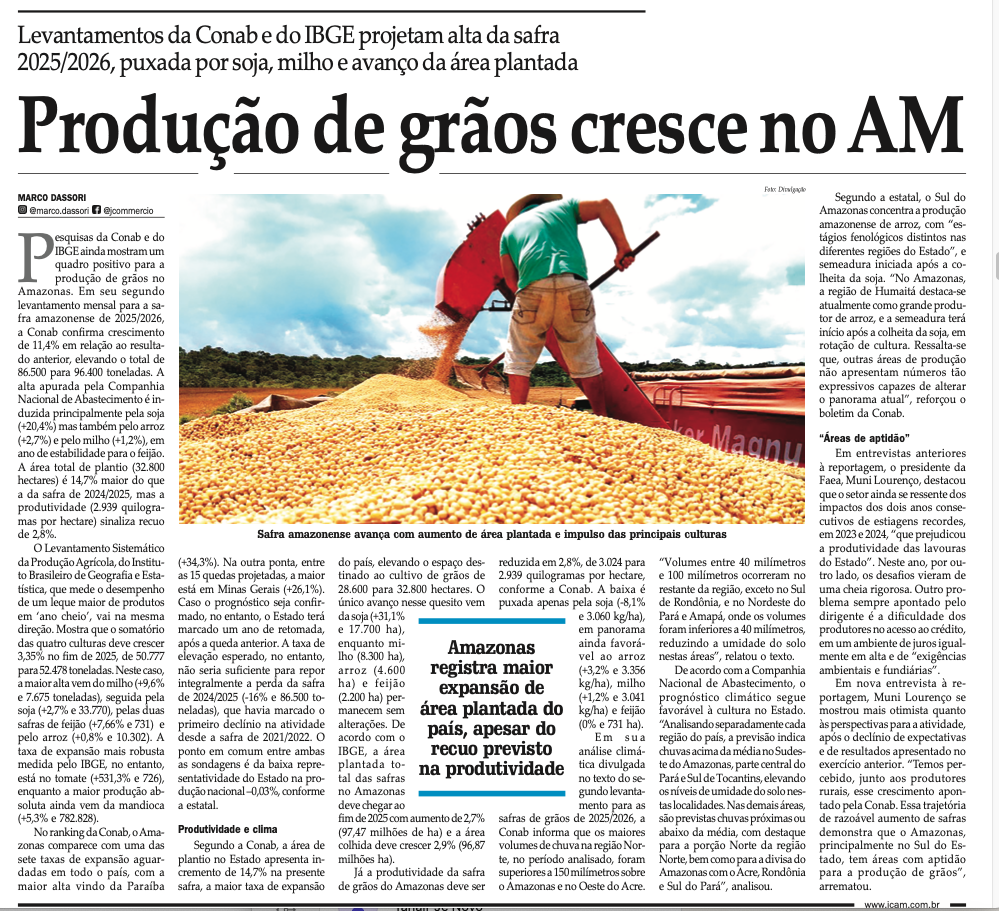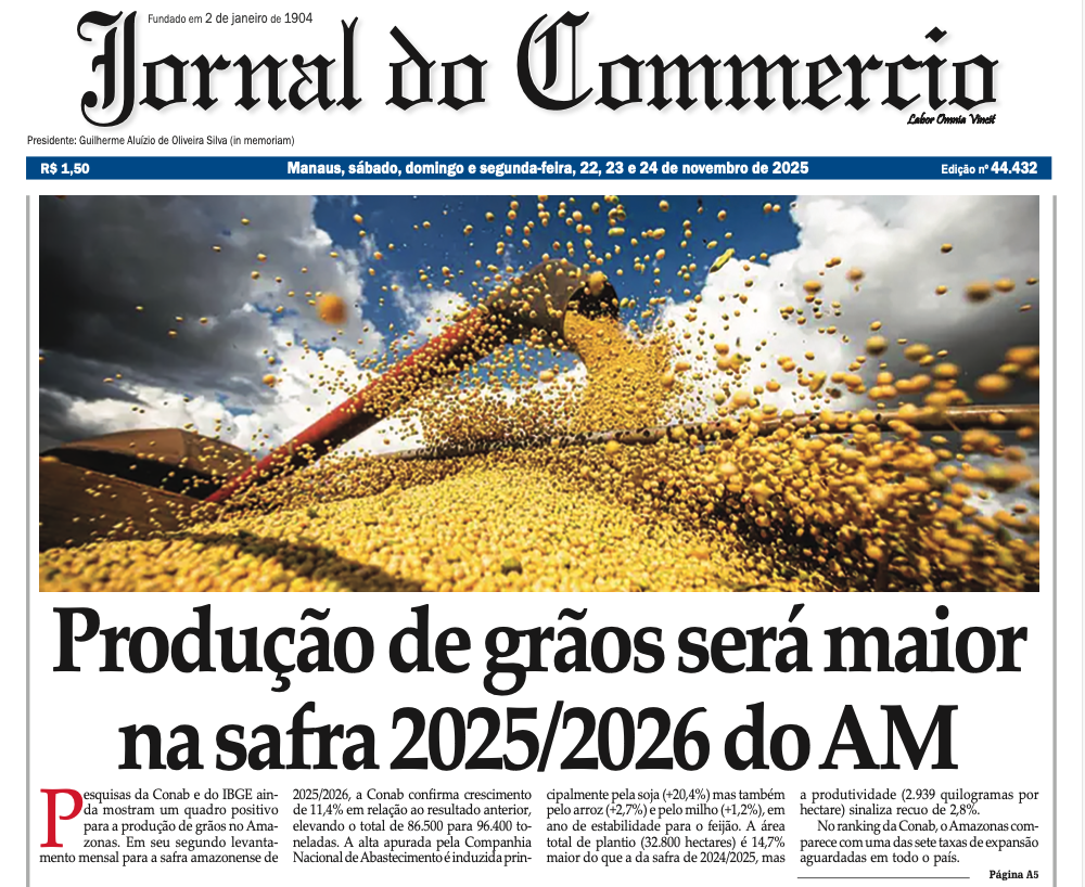 Mais uma matéria do jornal que mais entende de economia no Amazonas: o centenário Jornal do Commercio, o nosso JC, onde tenho o prazer de escrever semanalmente desde 2003. Já são 22 anos com total liberdade para expor o que penso — ultrapassando mais de mil artigos publicados. O jornalista econômico Marco Dassori faz uma análise detalhada, com base em dados oficiais da CONAB e do IBGE. A matéria ainda traz a opinião do presidente da FAEA, Muni Lourenço. O acadêmico em área do AGRO é de vital importância ao Amazonas, seja ele da UEA, UFAM ou IFAM, mas não pode esquecer que vem da política as definições do que acontece em termos sociais, econômicos e ambientais. Não tem como separar, se ficar calados, cada vez mais as atividades lícitas são travadas, os empregos diminuem e empreendedores acabam seguindo para outros estados. Tem ambientalista que adora comer um OVO, mas ele esquece que a galinha para botar esse OVO tem que comer milho e soja. Idem a piscicultura, a suinocultura, bovinocultura, etc. Sigo fazendo minha parte!
