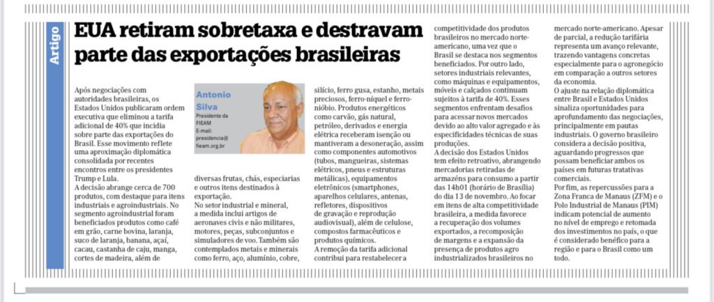 Artigo do presidente da FIEAM, Antonio Silva, publicado no Jornal ÀCRÍTICA.