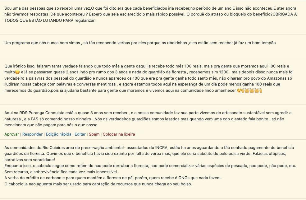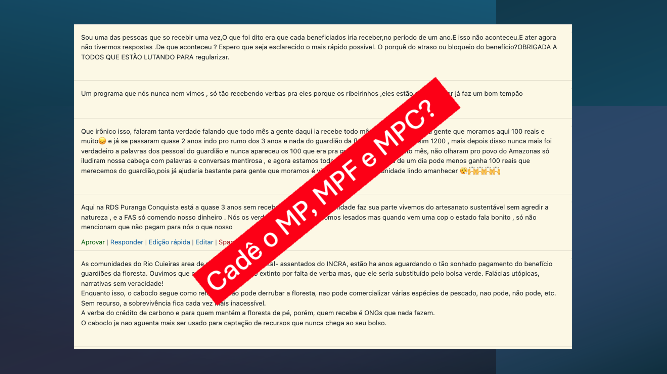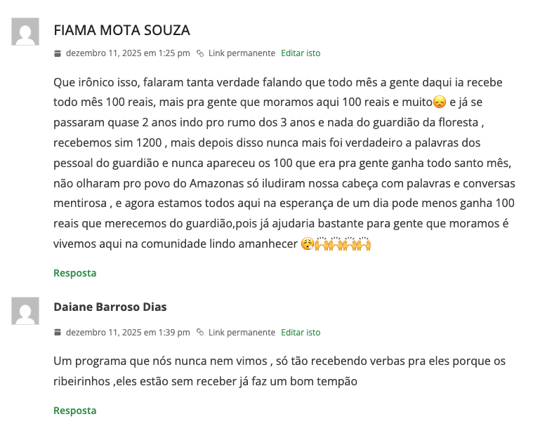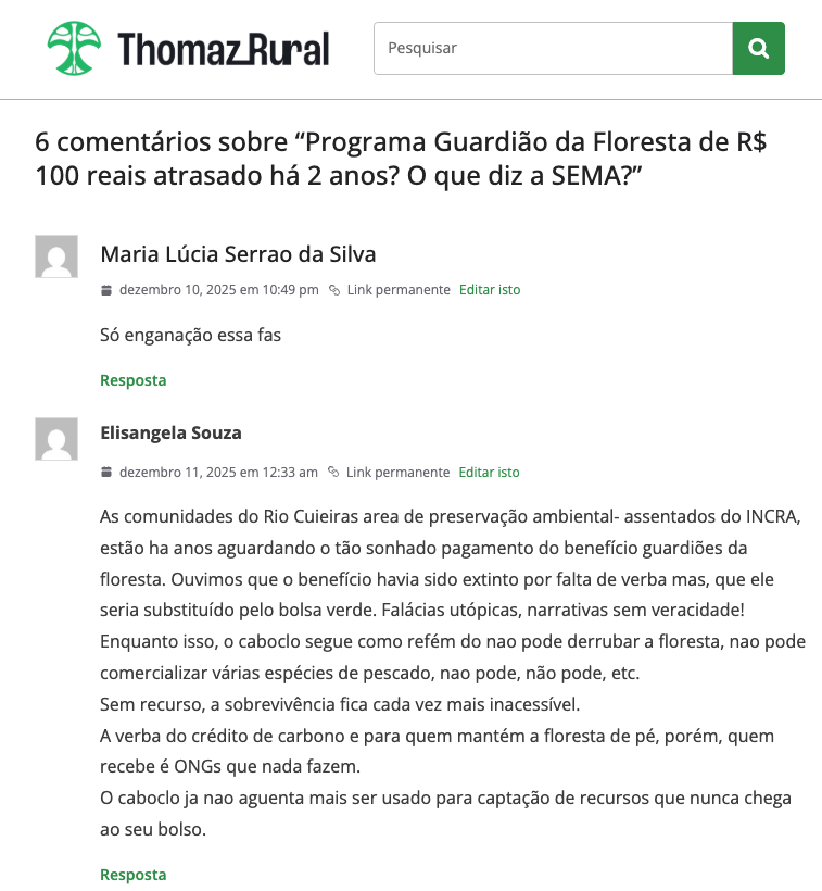 Espero que o MP, MPF e MPC avaliem esses comentários recebidos no THOMAZ RURAL. Idem o governador Wilson Lima. Não tem outra definição: Imoral! Continuem mandando mensagens, eu vou divulgar TODAS para que a SEMA tome ciência e se manifeste.