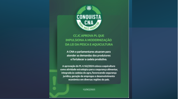 Brasília (15/12/2025) – Para a Confederação da Agricultura e Pecuária do Brasil (CNA), o Projeto de Lei 4.162/2024 representa um avanço para o desenvolvimento da aquicultura no país e destaca o setor como uma atividade estratégica para a segurança alimentar, geração de empregos e o desenvolvimento territorial.