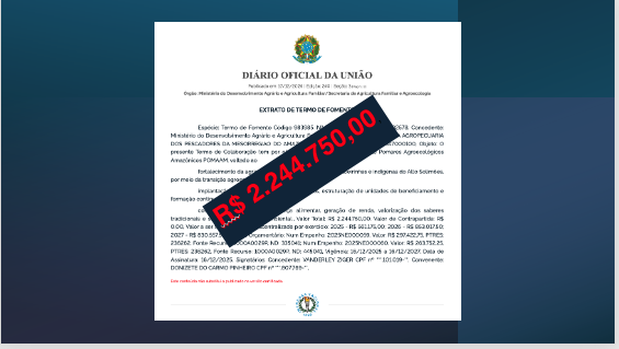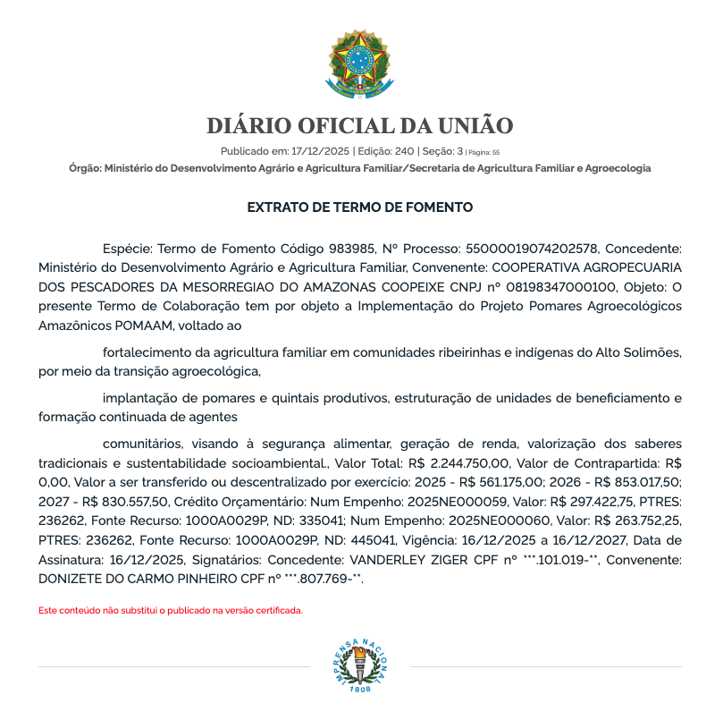 Trata-se de repasse no valor total de R$ 2.244.750,00, destinado à Cooperativa Agropecuária dos Pescadores da Mesorregião do Amazonas (COOPEIXE), com recursos oriundos do Ministério do Desenvolvimento Agrário e Agricultura Familiar, por meio da Secretaria de Agricultura Familiar e Agroecologia. Eu acho que esse valor deveria ser melhor distribuído entre associações e cooperativas dando maior abrangência territorial e de beneficiários. A concentração de um valor muito alto para apenas um grupo formal é de difícil execução, ainda mais quando envolve diversas atividades. Quem vai acompanhar a execução? Pelo visto é para POMARES AGROECOLÓGICOS. Façam o ZEE do Amazonas o mais rápido possível para evitar desperdício de recurso público. Sigo fazendo minha parte.