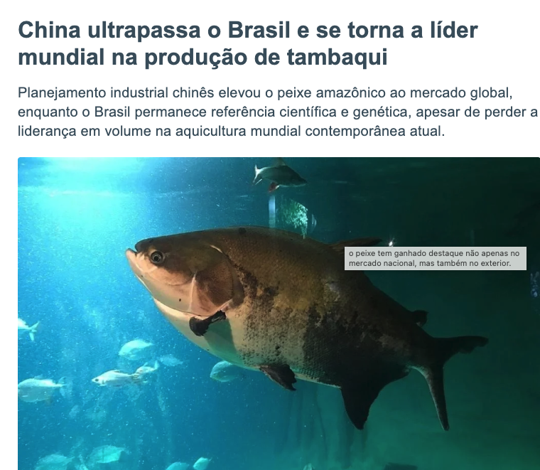 Veja, abaixo, a matéria sobre a produção de tambaqui na China. A Alemanha já está produzindo pirarucu.