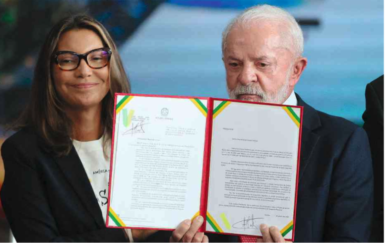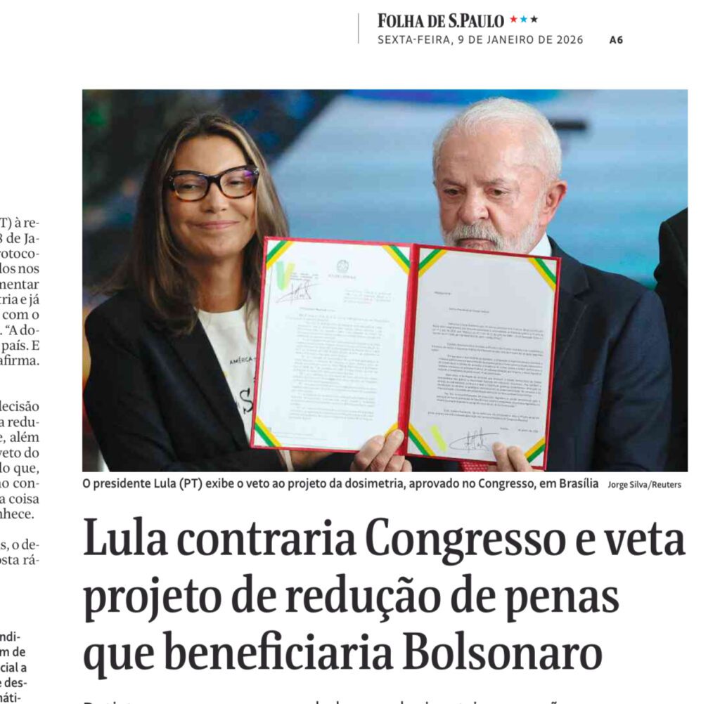 A foto não mente. O Lula está ali de cara fechada, olhando para o chão, parecendo que foi obrigado a assinar esse papel sem vontade nenhuma. Já a Janja? Está do lado com um sorrisinho de deboche, com cara de quem ganhou a briga e manda mais que ele. Num assunto sério desses, o presidente parece acuado e a esposa está ali, rindo, como se tudo fosse uma grande brincadeira ou uma vitória pessoal dela. Que Brasil é esse onde ele baixa a cabeça e ela ri da situação? Só analisei a imagem da FOLHA DE SÃO PAULO.