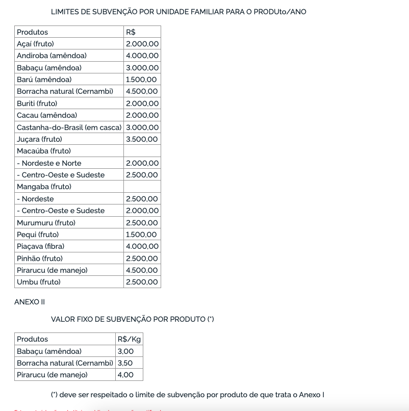 - Borracha natural (Cernambi): Limite de R$ 4.500,00/ano e bônus fixo de R$ 3,50/kg.