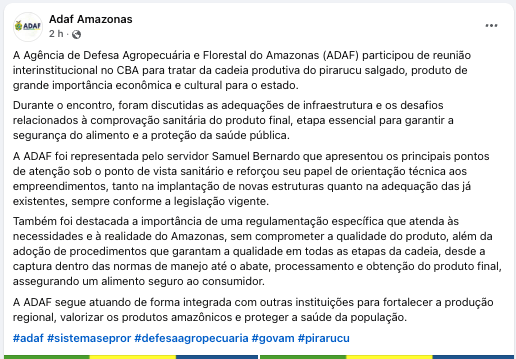 Esse encontro foi articulado pelo José Maria, grande autoridade no manejo do pirarucu, em parceria com o CBA. Mesmo com um convite feito em cima da hora, a presença maciça de órgãos ligados ao tema foi excepcional. Só gratidão! Após a reunião, recebi a seguinte mensagem do amigo Zé Maria, detalhando os avanços: “Na verdade, foram discussões muito produtivas. Como encaminhamento, vamos criar um grupo de trabalho e vou passar o material que tenho para contribuir nas definições das estruturas e adequação das normas de produção. O CBA também vai contribuir nas análises e outras atividades. Além disso, foi dada a notícia da tramitação de um projeto via CBA, pelo Fundo Amazônia, para a construção de estruturas para o manejo. Estiveram presentes representantes de peso: IDAM, ADAF, MAPA, MPA, SEPA, SEDECTI, AEPA, CONAB e CBA“. Valorizo imensamente esse tipo de encontro. Afinal, iniciativas assim têm todas as condições de gerar mais renda para as comunidades que trabalham com manejo, entregando um produto saboroso e com maior tempo de prateleira. Vou acompanhar de perto esse assunto, até porque prefiro muito mais o nosso pirarucu seco salgado do que o bacalhau. Muito bom ver o CBA envolvido nessa pauta.